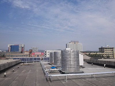宿舍樓頂為平屋頂時一般把太陽能與空氣源熱泵放置樓頂,采用太陽能與空氣能輔助加熱方式,在光照充足的情況下,只利用太陽能就可以把水加熱,在太陽能不足或陰雨天氣的情況下,使用空氣能進(jìn)行輔助加熱。兩種能源相結(jié)合,環(huán)保、節(jié)能,全天候、全自動、低能耗、365天運(yùn)行。